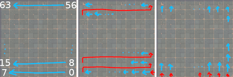 I was also inspired by modern chess engines which use bitboards to represent the game state in a compact manner that is both fast to copy (useful for recursion) and fast to process (I could use bitwise operators to operate on all 64 tiles in parallel rather than looping over arrays of bytes). I created a new puzzle representation that could be passed into the solver to take advantage of these ideas. With an 8x8 grid and 4 states to track, I chose to use 4 u64