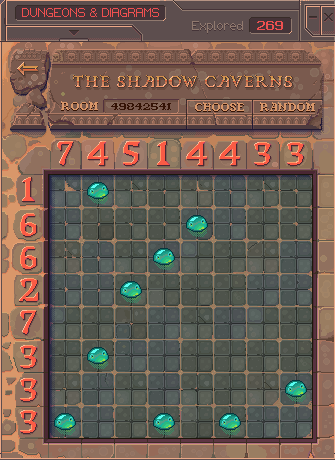 My solver doesn’t use any logical deduction (for example “this row needs 4 walls and has 4 spaces, therefore they all must be walls”, or, “the space between a monster and a treasure room must be a wall”). I originally wanted to incorporate these into the solver, but with the speed I achieved they simply weren’t necessary. If I were to attempt solving larger puzzles (like 16x16), they perhaps would be mandatory to have acceptable solve times. There exists an online puzzle generator which can produce larger puzzles, but occasionally it places invalid treasure rooms.